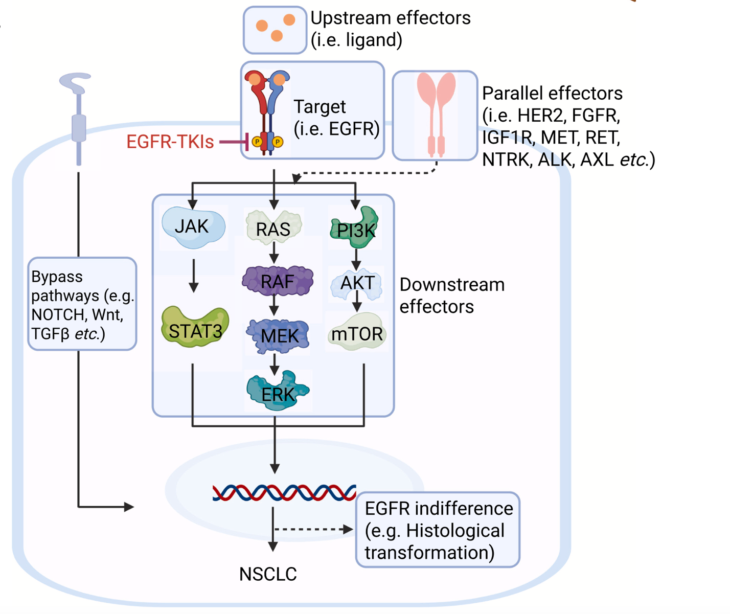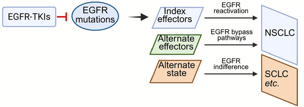 EGFR依赖型是EGFR-TKI抑制EGFR后,EGFR通路下游信号分子再次激活,导致肺癌细胞对EGFR-TKI耐药,该机制包括EGFR本身变化比如扩增和突变、EGFR上游效应分子变化包括配体和调节因子的异常表达、平行效应分子的变化比如其它受体酪氨酸激酶的激活、以及EGFR通路下游比如PI3K/AKT/mTORRas/Raf/MEK/ERK等效应分子的激活。EGFR独立型是EGFR-TKI抑制EGFR后,其它通路绕过EGFR信号通路而激活下游的转录因子,该机制包括TGFβNotchWnt/β-catenin等信号的激活,以及细胞循环和凋亡、DNA损伤修复、代谢和肿瘤微环境异常等。EGFR冷漠型是产生一种与原来EGFR信号通路完全无关的细胞状态,比如EGFR突变驱动的非小细胞肺癌转变为小细胞肺癌。基于对这些耐药机制的理解,将会对肺癌耐药患者提出相应的治疗策略,包括单靶点用药和多靶点联合用药,有些已经在临床试验中进行评估。
